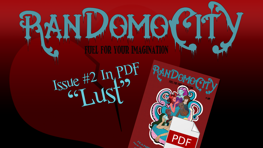Randomocity #2 (themed 'Lust') is professionally printed at half-letter size in a durable, saddle-stitched book with quality paper, at full-bleed with full-color graphics.